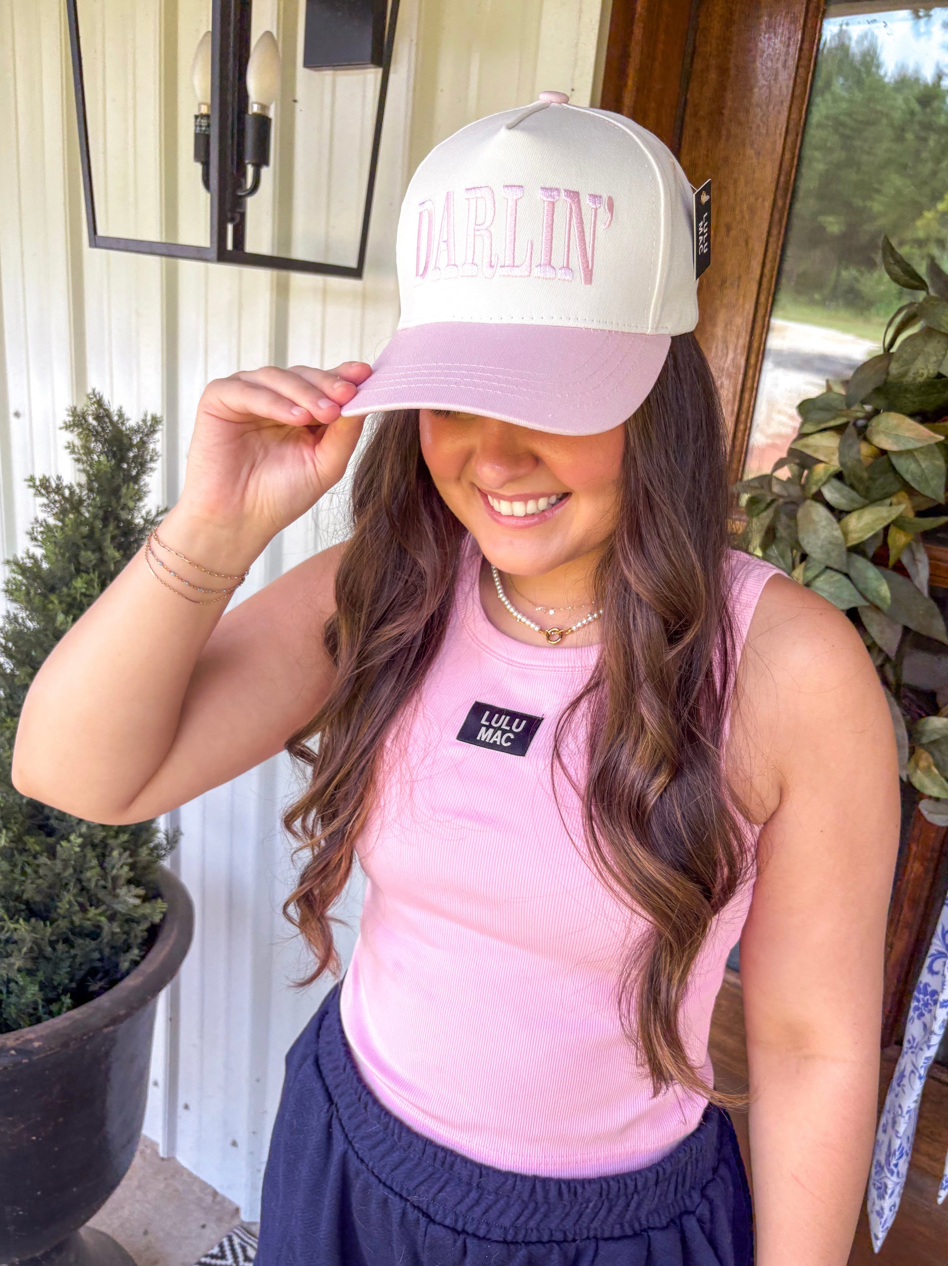 This light pink Darlin' Cap combines charming style with everyday comfort. Crafted for a perfect fit, it features the endearing "darlin'" embroidery that adds a subtle, personalized touch. Ideal for casual outings or gifting, this cap offers both a fashionable statement and practical sun protection.