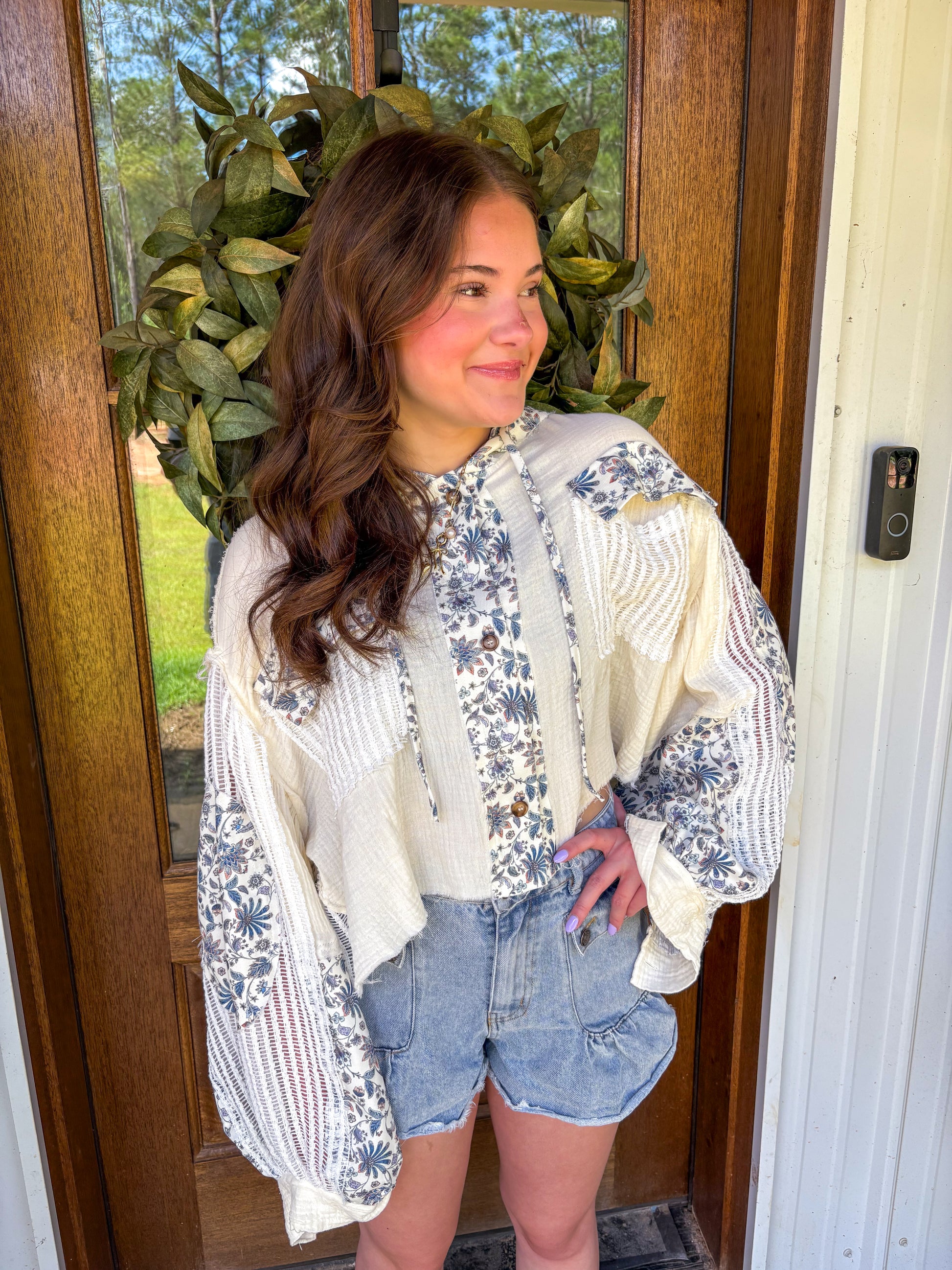 Introducing ! Designed with a placket jacket and balloon sleeves, this top is made from soft twill fabric and features a cropped fit. The frayed edge details add a touch of texture, while the pointed floral pattern adds a feminine touch. Elevate your wardrobe with this unique and stylish piece.