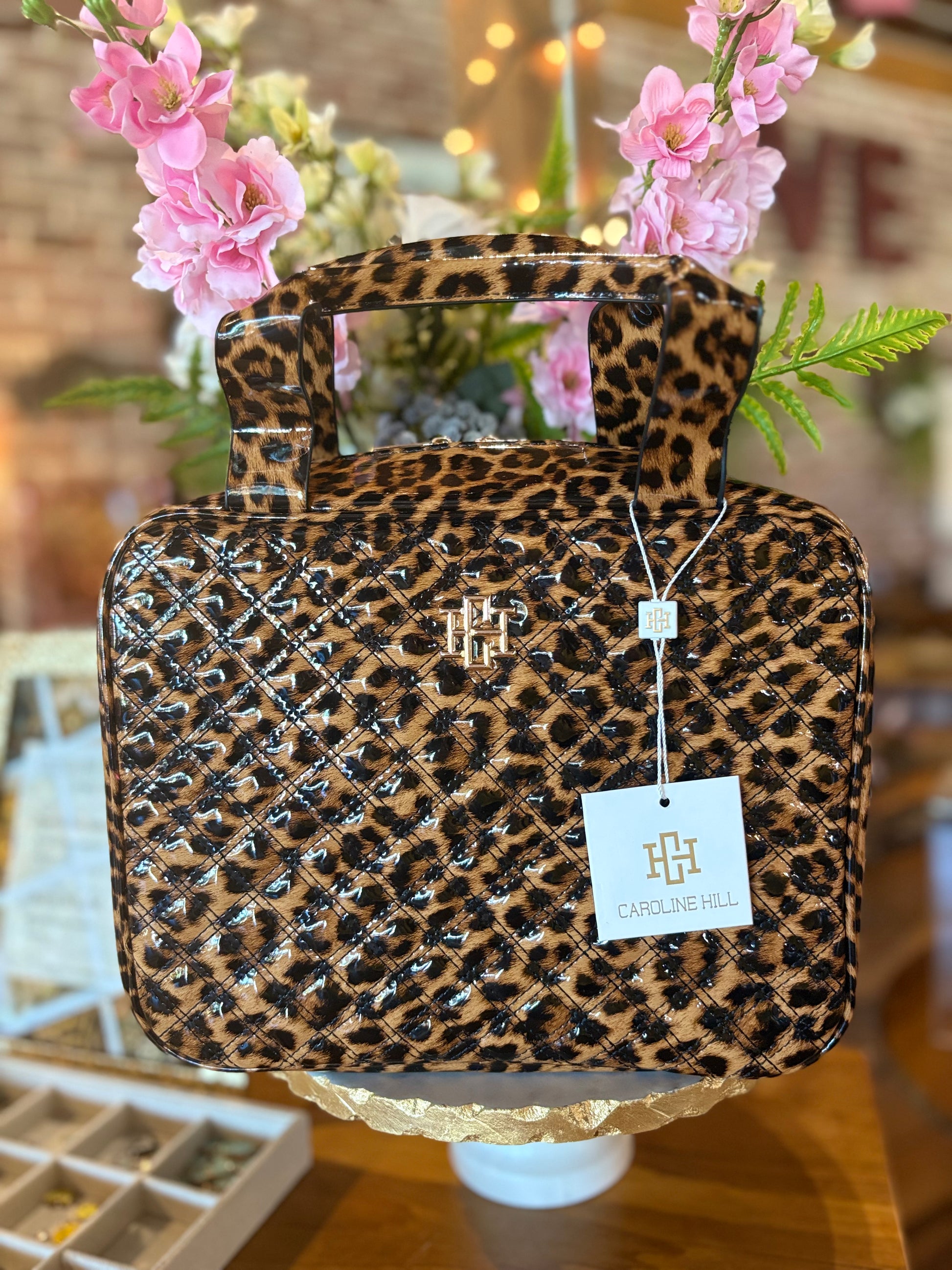 This large case is the ultimate makeup and travel piece. It features a quilted vegan patent leather fabric and two top carrying handles. The three sided zipper allows the case to unfold and lay completely flat, and the interior is lined with fabric with a clear protective material. For ultimate organization, this case has four clear removable pouches that are attached to the interior with velcro. Each removable case has a zipper closure. The possibilities are endless when it comes to what this case can carry- cosmetics, toiletries, chargers, and more. Case: 9.5" tall by 12" wide 4" base Large Clear Pouch: 8.5" tall by 11" wide 1.25" base Tall Slim Clear Pouch: 8.5" length 3.25" width 1.75" height Two Matching Clear Pouches: 7.5" length 4.25" width 1.5" height
